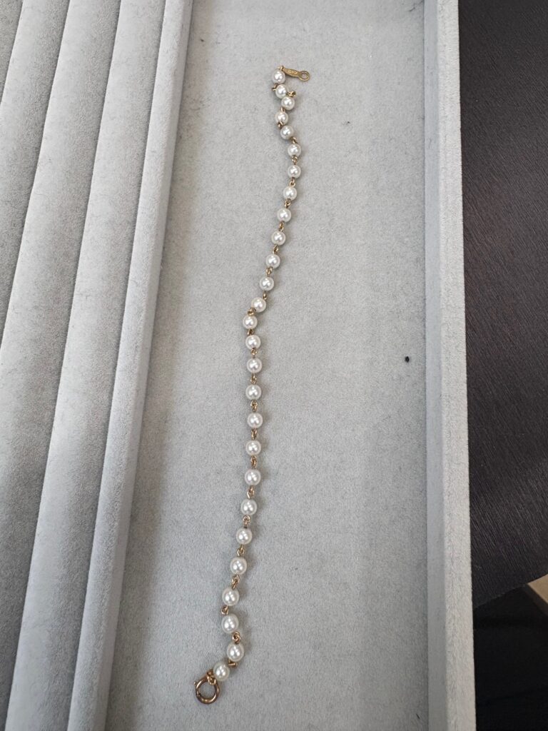 一福久留米店にてK14金・ベビーパール/真珠ブレスレットを高額査定にて買取りさせて頂きました。金やプラチナなど貴金属製のアクセサリー高価買取中ですので一福久留米店をご利用下さい!ダイヤモンドやルビー・サファイヤ・エメラルドなどの宝石など、1点だけでも喜んで高額買取りしております。メッキかもしれない、壊れている、などどうかな?ずっと使っていて傷だらけの指輪だけど?ネームが入っているリングだけど大丈夫?石が外れた指輪とか大丈夫なの?とお悩みのお品も誠心誠意丁寧な査定で少しでも高く買取させていただきます。お電話での問い合わせ、店頭での見積もりだけでもお受けしております。お電話、ご来店を心よりお待ちしております。